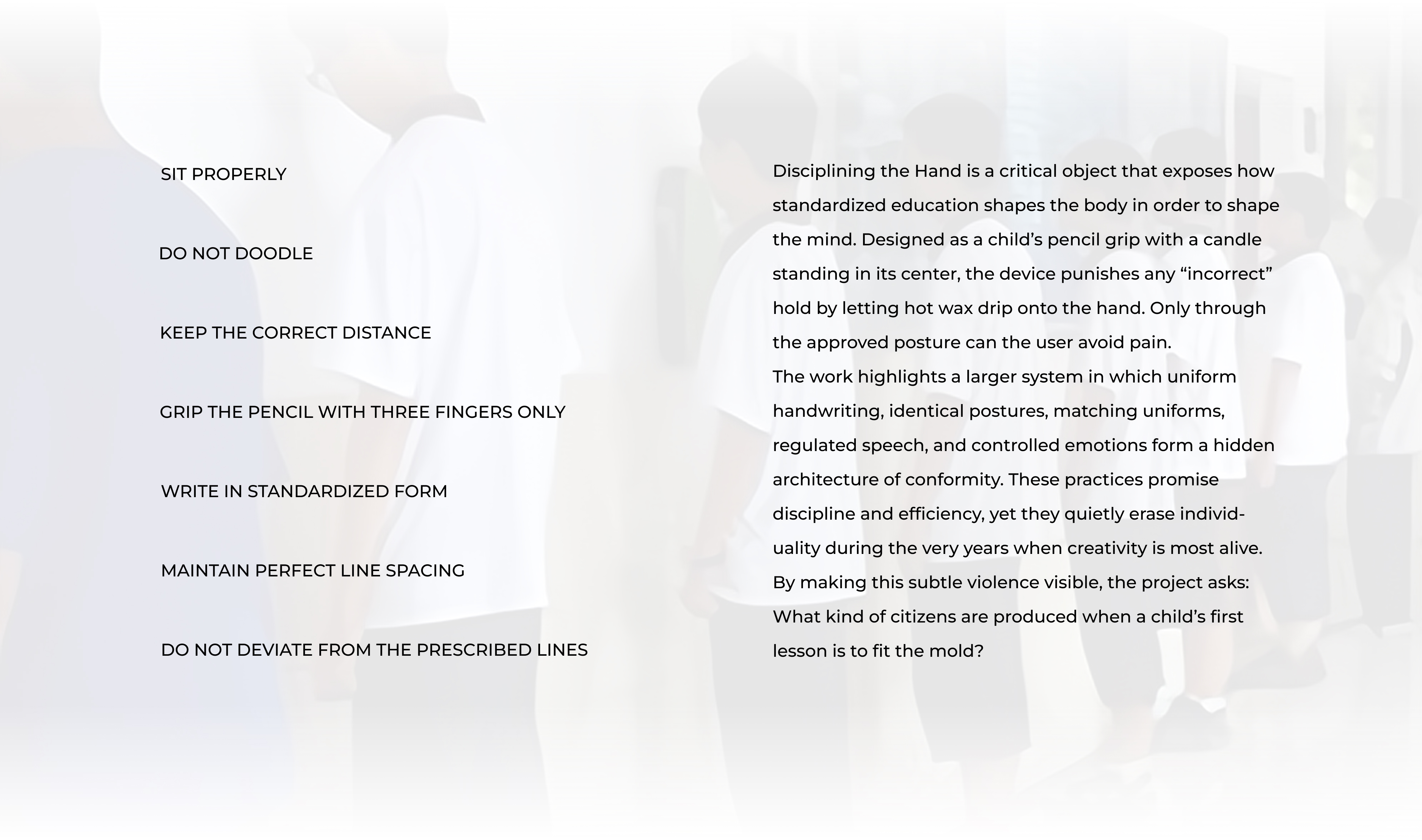 Disciplining the Hand examines how standardized education shapes the body before it shapes the mind. The correct grip, the correct posture, the correct voice—every “proper” gesture becomes a tool for producing uniform students at the cost of creativity. If my hand must conform, my imagination learns to conform with it.